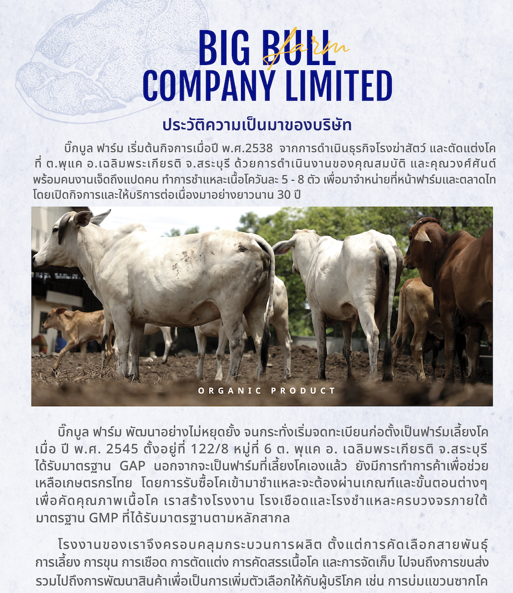 บิ๊กบูล ฟาร์ม เริ่มต้นกิจการเมื่อปี 2538 จากการดำเนินธุรกิจโรงฆ่าสัตว์และตัดแต่งโค
