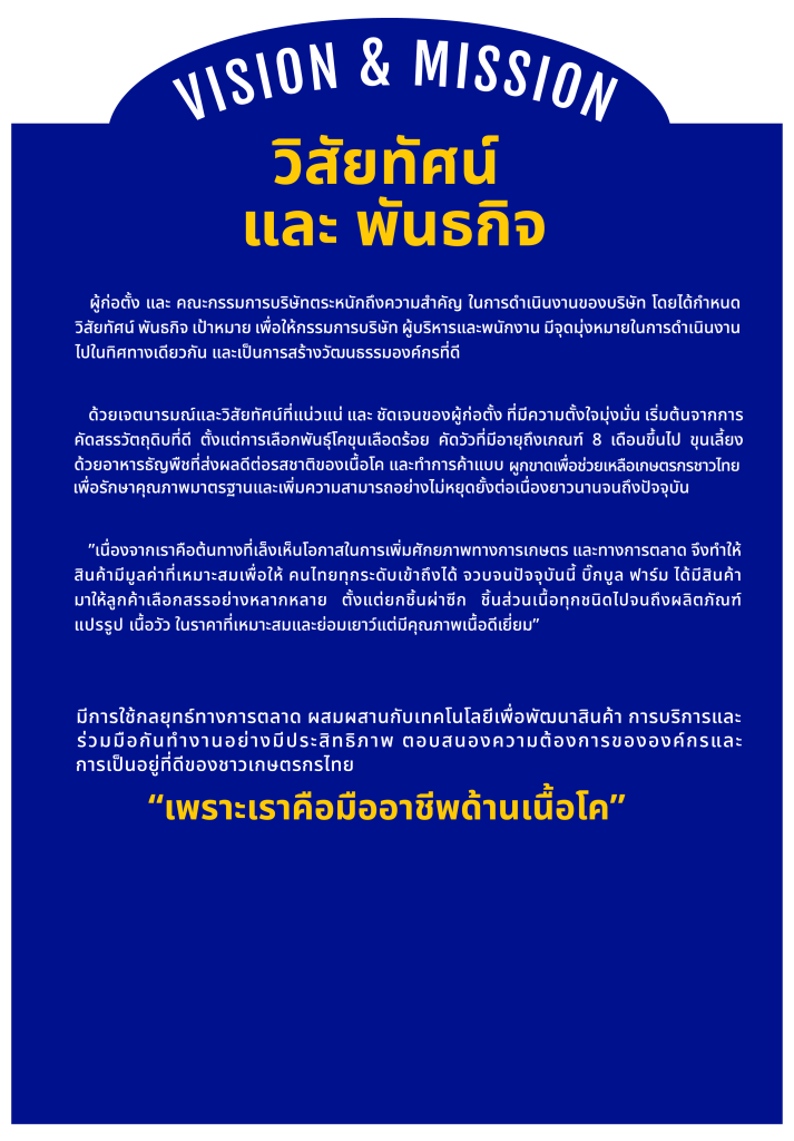 ได้รับมาตรฐาน GAP นอกจากจะเป็นฟาร์มที่เลี้ยงโคเองแล้ว ยังมีการทำการค้าเพื่อช่วยเหลือเกษตรกรไทย โดยการรับซื้อโคเข้ามาชำแหละ จะต้องผ่านเกณฑ์และขั้นตอนต่างๆ เพื่อคัดคุณภาพ เนื้อโค เราสร้างโรงงาน โรงเชือด และโรงชำแหละครบวงจร