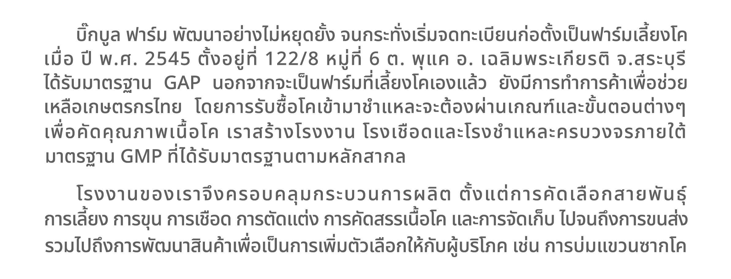 ได้รับมาตรฐาน GAP นอกจากจะเป็นฟาร์มที่เลี้ยงโคเองแล้ว ยังมีการทำการค้าเพื่อช่วยเหลือเกษตรกรไทย โดยการรับซื้อโคเข้ามาชำแหละ จะต้องผ่านเกณฑ์และขั้นตอนต่างๆ เพื่อคัดคุณภาพ เนื้อโค เราสร้างโรงงาน โรงเชือด และโรงชำแหละครบวงจร